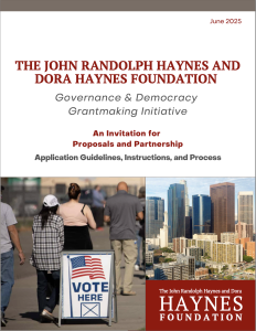 THE HAYNES FOUNDATION has been a force for change in the Los Angeles Region (comprised of the counties of Los Angeles, Ventura, San Bernardino, Riverside, and Orange) for over nine decades. The Foundation’s founders, Dr. John Randolph Haynes and Dora Haynes were passionate advocates of involved citizenship who believed that through social science research, the Foundation not only could identify critical social and political problems in Los Angeles but also offer solutions to them. The Foundation awards major research grants on governance and democracy in the Los Angeles region, archival grants, doctoral dissertation fellowships, and faculty fellowships.