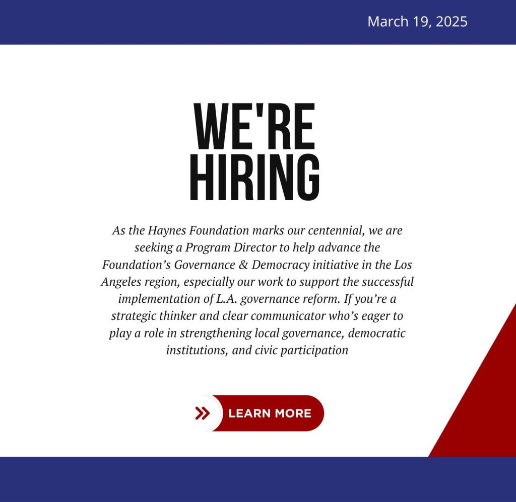 The Foundation particularly invites proposals focused on Los Angeles County governance reform, as well as county governance reform across the broader LA region. Applicants can view the full RFP, including suggested topics, here.